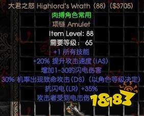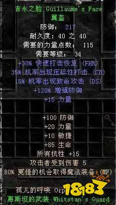 3、头盔:绿色吉永之脸(带有35%压碎性打击CB,触发后按当前生命值一定比例掉血,此属性对付高血量的精英怪和BOSS非常实用),也就是暗黑2玩家常说的CB头。
