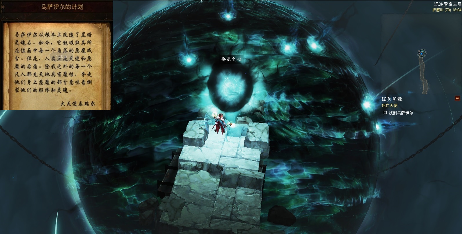 获得了死亡之力的奈非天前往马萨伊尔的藏身之地,混沌要塞的最核心,要塞之心。要塞之心原本是安放世界之石的地方,在世界之石被偷走后就空荡了下来,直到马萨伊尔进入混沌界收割灵魂之力,并且利用夺来的黑暗灵魂石进行改造后,把其安放在要塞核心利用整个混沌要塞的魔力加持,用来吸取所在位面中的恶魔成分,计划达到他最终的全面消灭恶魔成分并消灭全部恶魔与人类的目的。此时的要塞核心由于混沌界的魔幻力量、混沌要塞魔力、死亡之力以及黑灵魂石之力共同交错纵横从而变得狰狞恐怖。