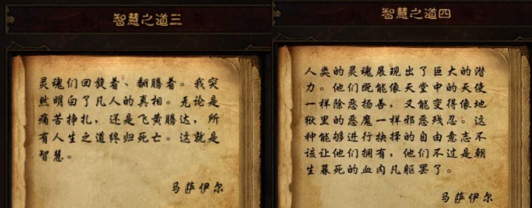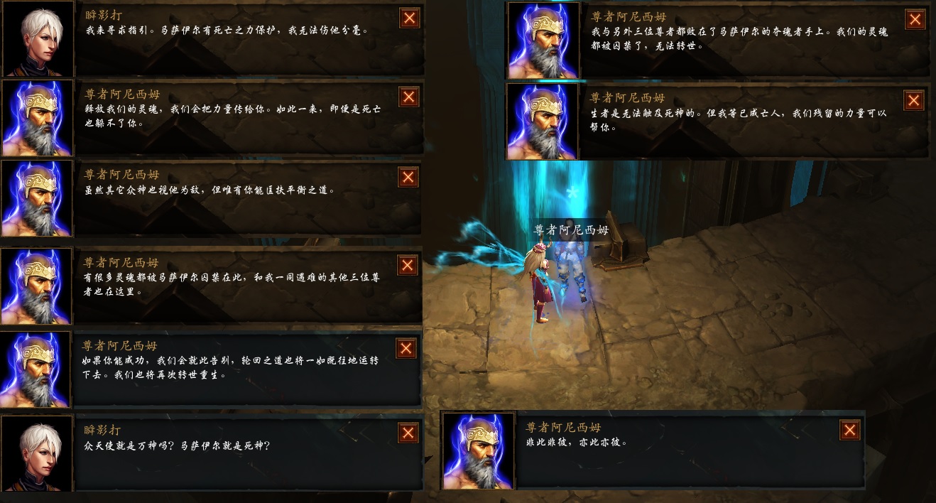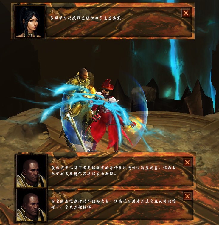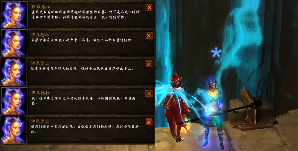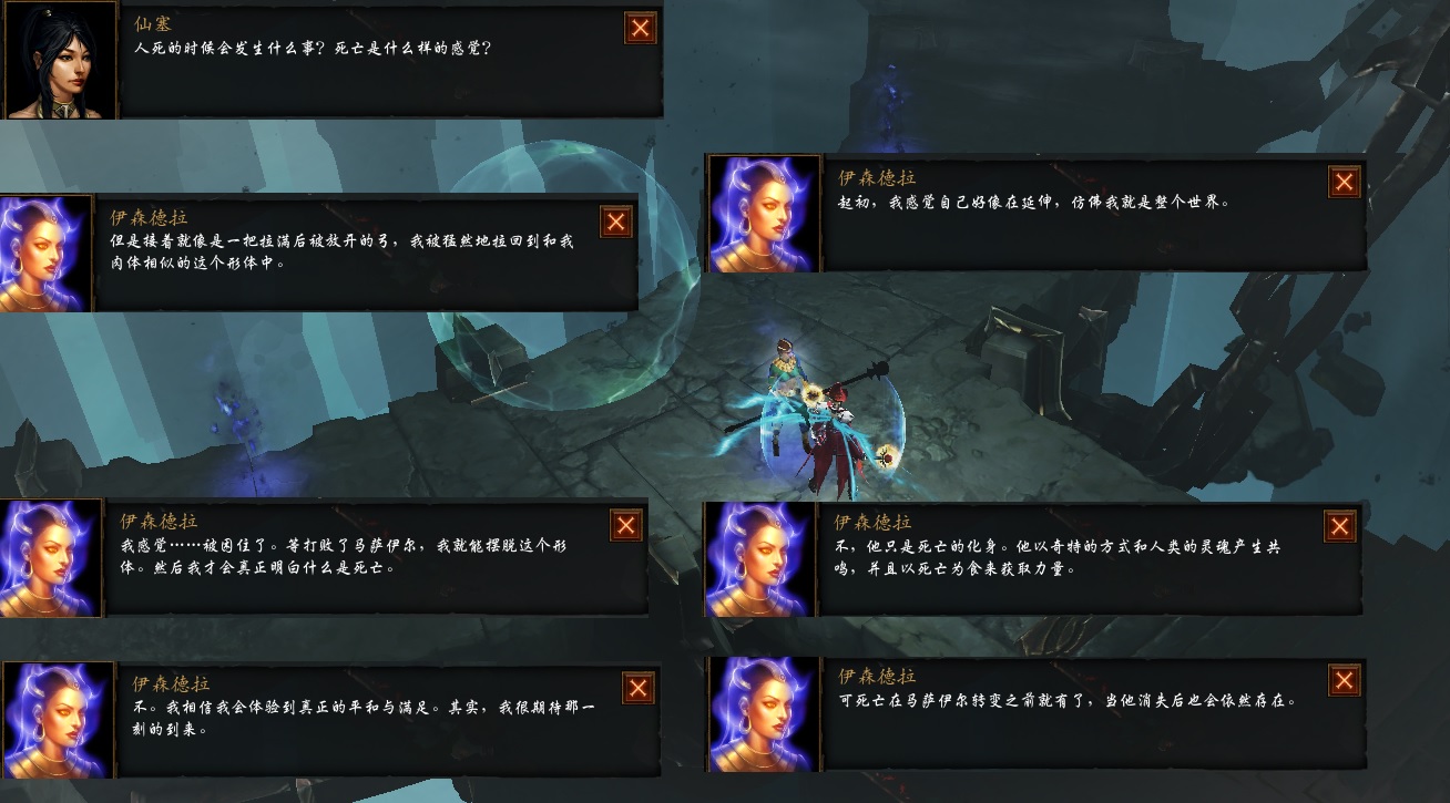 暗黑3在剧情方面做的非常棒,简直是精彩,在混沌界一、二层,14名英雄都会遇到他们各自的导师,对话都各有千秋和具有不同内涵,强烈建议大家都体验一番。伊森德拉强调了马萨伊尔的力量来源,也指出了这种灵魂的的死亡力量也可以转给奈非天,用以打败马萨伊尔并解脱自己的灵魂。