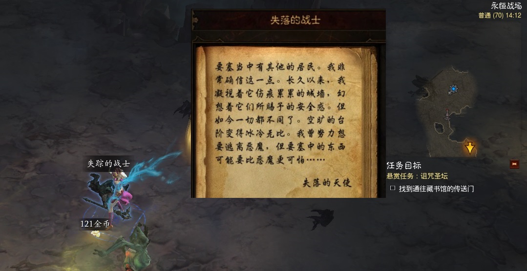 这位失踪的战士,自称是一位失落的天使,他是混沌要塞的原居民,某一天他察觉到要塞当中出现了其他的居民,认为混沌要塞的城墙不再能给予他熟悉的安全感,这位天使战士开始对要塞中的比恶魔更可怕的东西感到恐惧,于是逃离了混沌要塞,但是不知什么原因还是死去了。