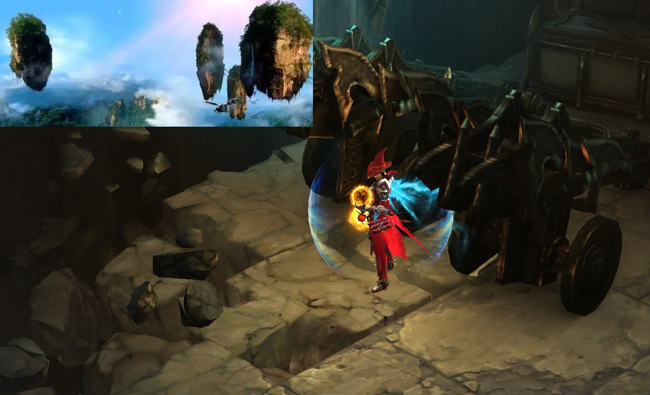 我们再来看奇幻之美,混沌界是个光怪陆离的世界,混沌要塞更是个奇幻无穷的地方。大家都还记得电影《阿凡达》吧,那里有一个非常奇幻的地方,哈利路亚山,这是一个悬浮山群,当笔者在电影中看到这片悬浮的哈利路亚山之后,整个人都是震惊无比的,虽然知道有天空之城之类的云端所在,但在潘多拉那绚丽变幻的星球上的哈利路亚山,让人第一次真正的感受到了悬浮奇幻之美。