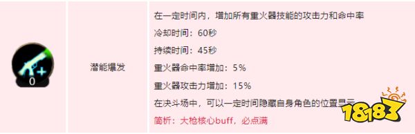 爆发buff技能集中火力,几乎是大枪登顶T0职业的重要技能,取消重火器的后摇让他的爆发能力堪称全职业第一。