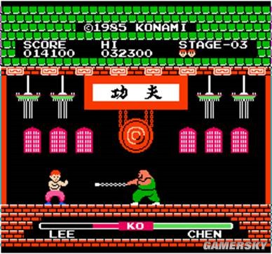 若说世界上第一款格斗游戏是哪个?当属科乐美1985年在FC上推出的《功夫》,游戏中玩家要控制功夫小子分别挑战5大能力各异的高手,本作第一次确立了人物分置屏幕2端,左右分列血槽,一对一战斗的游戏方式,非常具有开创意义。但《功夫》又是一款纯单人游戏,电脑AI水平也有限,游戏的耐玩度并不高,格斗游戏的潜力还并未真正爆发。