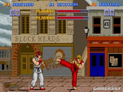 《街头霸王》初代就拥有丰富的角色设定,隆、肯、元、拳击手等风格各异的格斗家都在本作中得以确立,不过受限于当时的技术水平,玩家只能控制主角隆来一关关的挑战各个对手;双人对战时2P也只能控制肯,其除了颜色外,技能和隆一模一样,也无外乎当时人们都称之为“白人VS红人”。