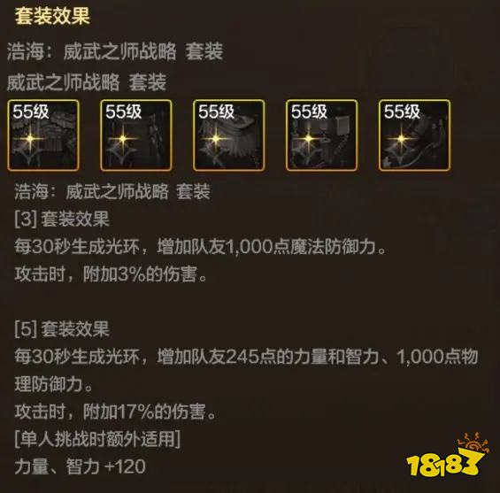 能给队友增加12%左右的伤害,且作为魔道学者皮甲精通套装之一,套装在原本给队友增加输出的基础上,升级后的套装附加了队友增防效果,魔道学者本身也自带减少敌人防御效果,且自身输出能力不弱的情况下搭配浩海:威武之师战略套套在当前版本非常受冲击世界BOSS或者降临罗特斯中大佬的喜爱,能够使玩家打出更高的个人伤害。