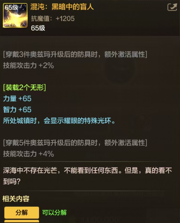 终末之始材料可用于升级60级史诗防具套装,当穿戴3/5件奥兹玛混沌升级防具时,将额外激活对应的技能攻击力加成属性。