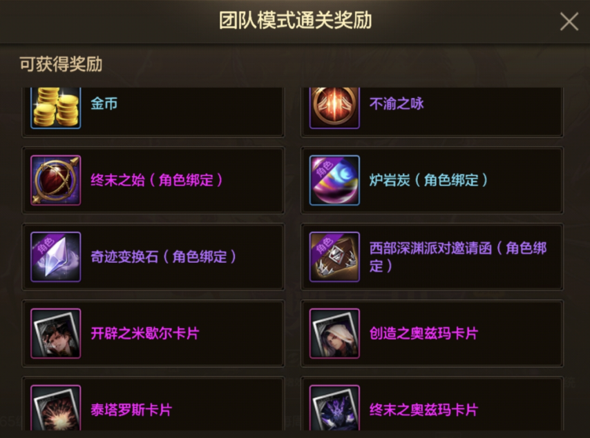 勇士们通关简单和困难模式后,翻牌有机会获得终末之始、神器卡片、神器级团队模式勋章、奥兹玛混沌升级防具等奖励。