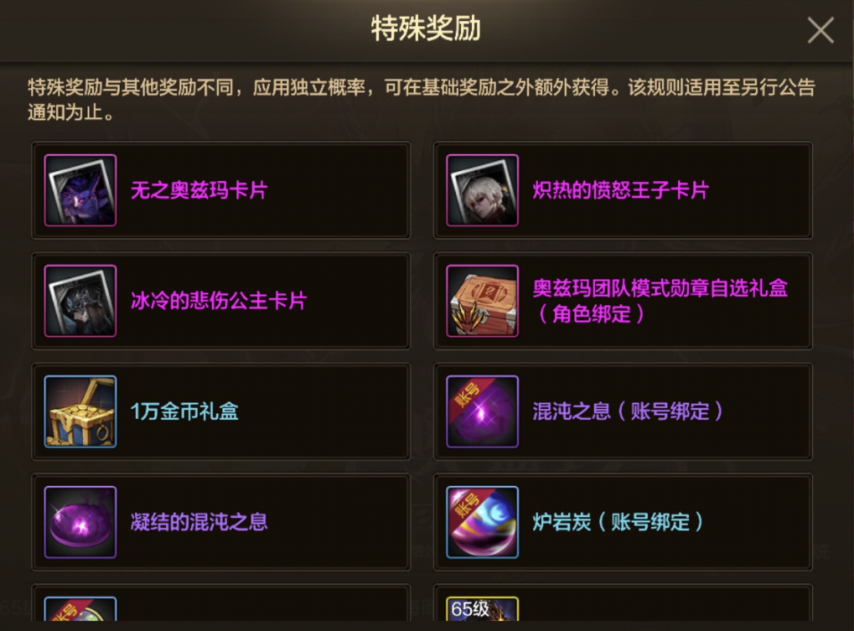 4月16日-5月21日05:59期间,勇士们累计参与降临:奥兹玛达到一定次数,可获得混沌支配者伤害字体礼盒、混沌支配者头像框礼盒、65级闪亮的一次性强化器(30天)(+15及以下)、幸运符(账号绑定)等奖励!