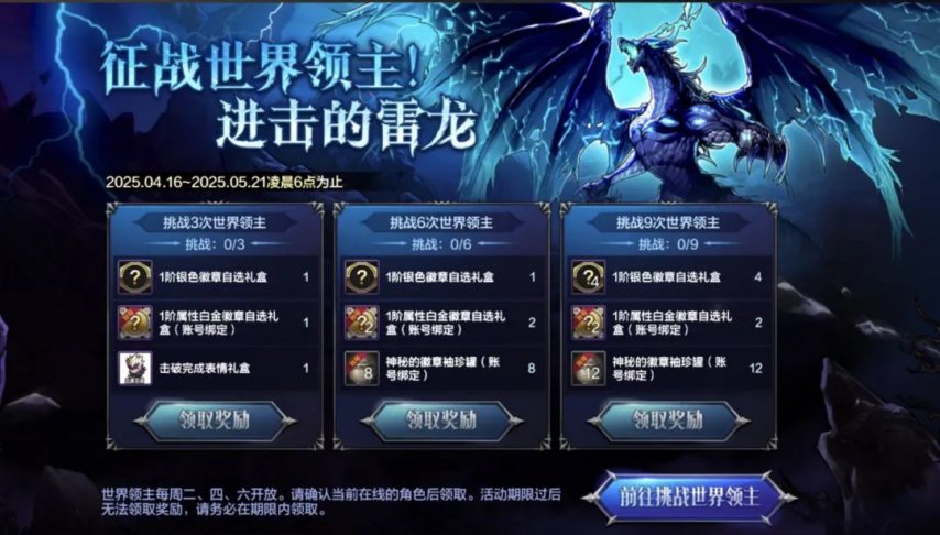 4月16日06:00-5月21日05:59期间,勇士们累计参与世界领主达到一定次数,可获得击破完成表情礼盒、1阶属性白金徽章自选礼盒(账号绑定)、神秘的徽章袖珍罐(账号绑定)、1阶银色徽章自选礼盒等奖励!