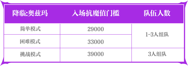 降临:奥兹玛分为简单、困难和挑战三种模式,其中简单和困难模式1~3人即可进行挑战,但挑战模式则需要3人组队挑战。同时,降临:奥兹玛将与降临:罗特斯共享奖励次数。