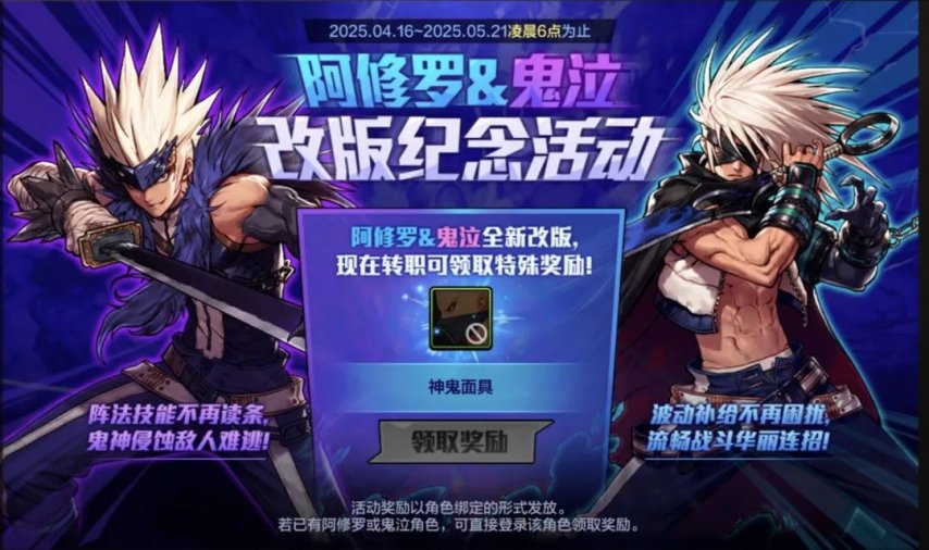 4月16日-5月21日05:59期间,勇士们使用阿修罗或鬼泣角色登录游戏,即可领取阿修罗&鬼泣改版纪念奖励礼盒,打开礼盒可获得神鬼面具奖励!