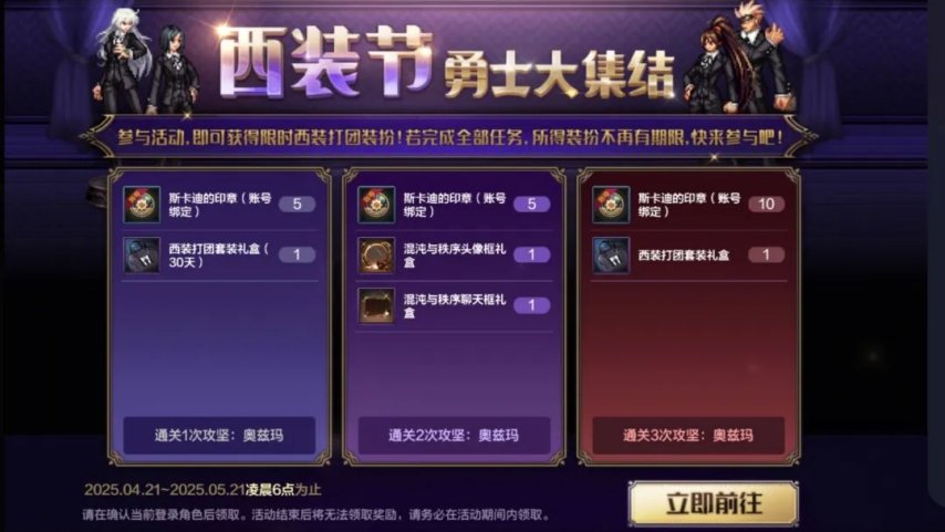 4月21日06:00-5月21日05:59期间,勇士们每完成1次团队模式通关活动,可获得西装打团套装礼盒(账号绑定)(30天)奖励,完成3次即可获得永久西装打团套装。